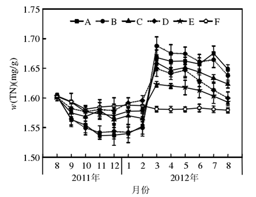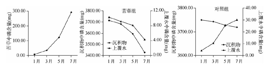 苦草對水體營鹽的去除率隨生物量的增加不斷增大,當生物量達到 2380.00g時,去除率放緩。苦草腐敗釋放的磷大部分被底泥吸附,少量進入水體。草腐敗分解具有階段性,前36d分解迅速,以后分解速率顯著下降。
