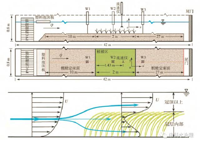 1) 冠層以上,水流不受苦草冠層的影響,時均流速呈對數分布; 冠層內部,由于冠層阻流面積在垂線分布上存在差異,冠層內時均流速呈逆梯度分布,且在床面附近出現局部流速最大值。